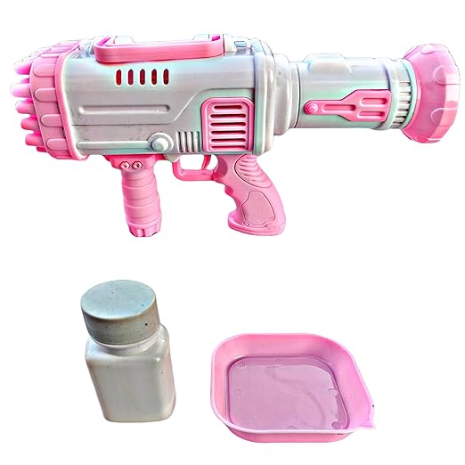 Gatling bubble machine 32 holes can output hundreds of bubbles per min,kids would be obessed with bubbles world.Also bubble gun used as mini fan when you take off the tip. Multi Bubbles Output Gatling bubble maker made of environmental friendly ABS plastic,BPA free,non-toxic and harmless.Kids can use this gatling bubble maker toy safely and enjoy the fun of making bubbles. Colour- Multi Colour
