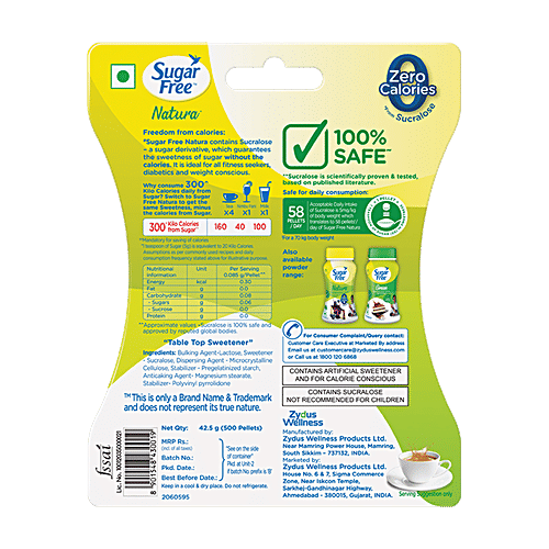 This Natura Sweetener - Zero Calories is made using Sucralose which is a derivative of Sugar. Sucralose tastes like Sugar but doesn't contain the same number of calories. Thus, it allows you to enjoy the sweet flavour of sugar without having to worry about gaining excess calories.