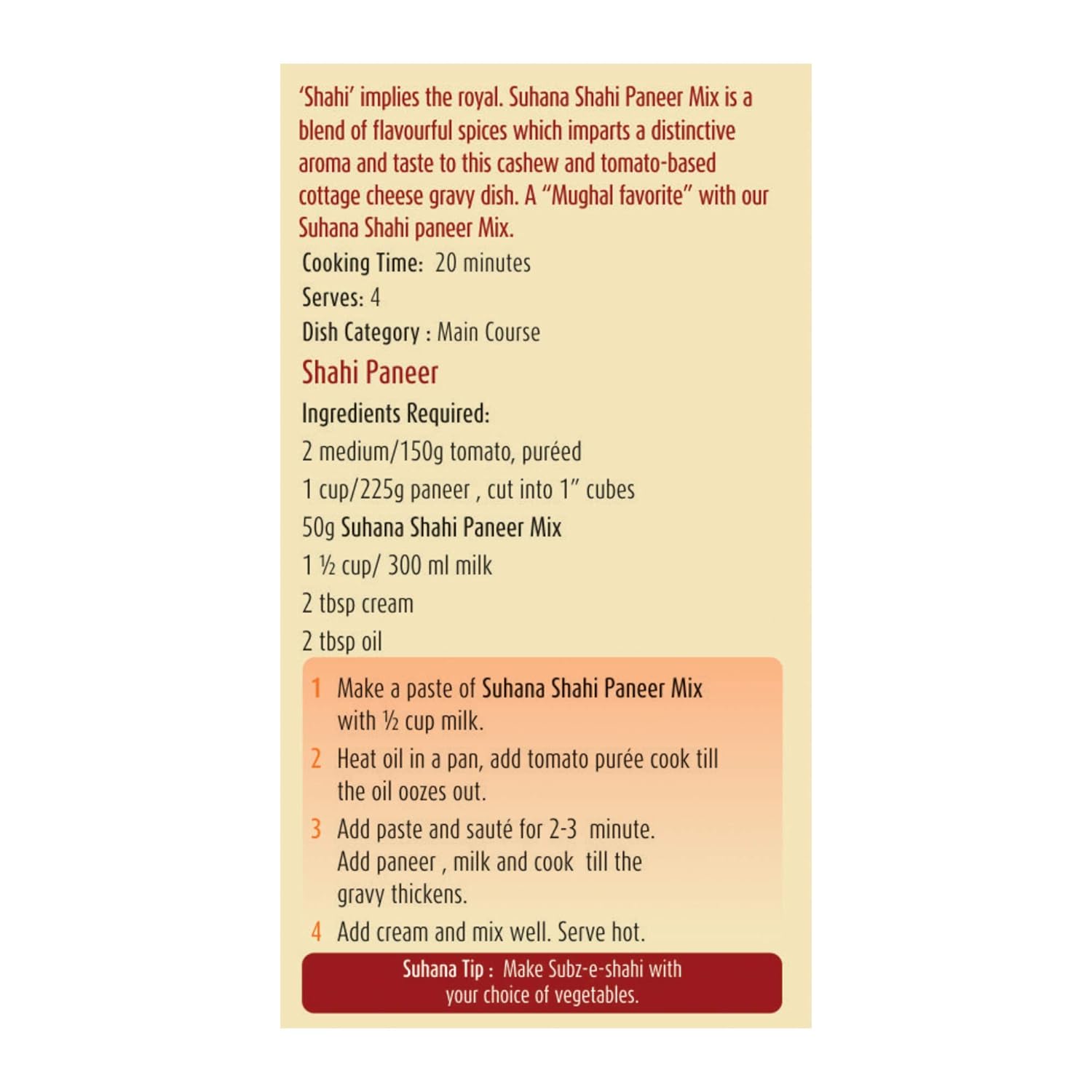 No added MSG, no artificial flavours, no added colours & preservatives Lip-smacking taste, super convenient & cooks in minutes Low Temperature Grinding so that the spices retains its Freshness and Aroma. Reduce cooking preparation time by using Suhana spice mixes range Use 'Suhana Shahi Paneer Mix' to create a truly memorable meal!