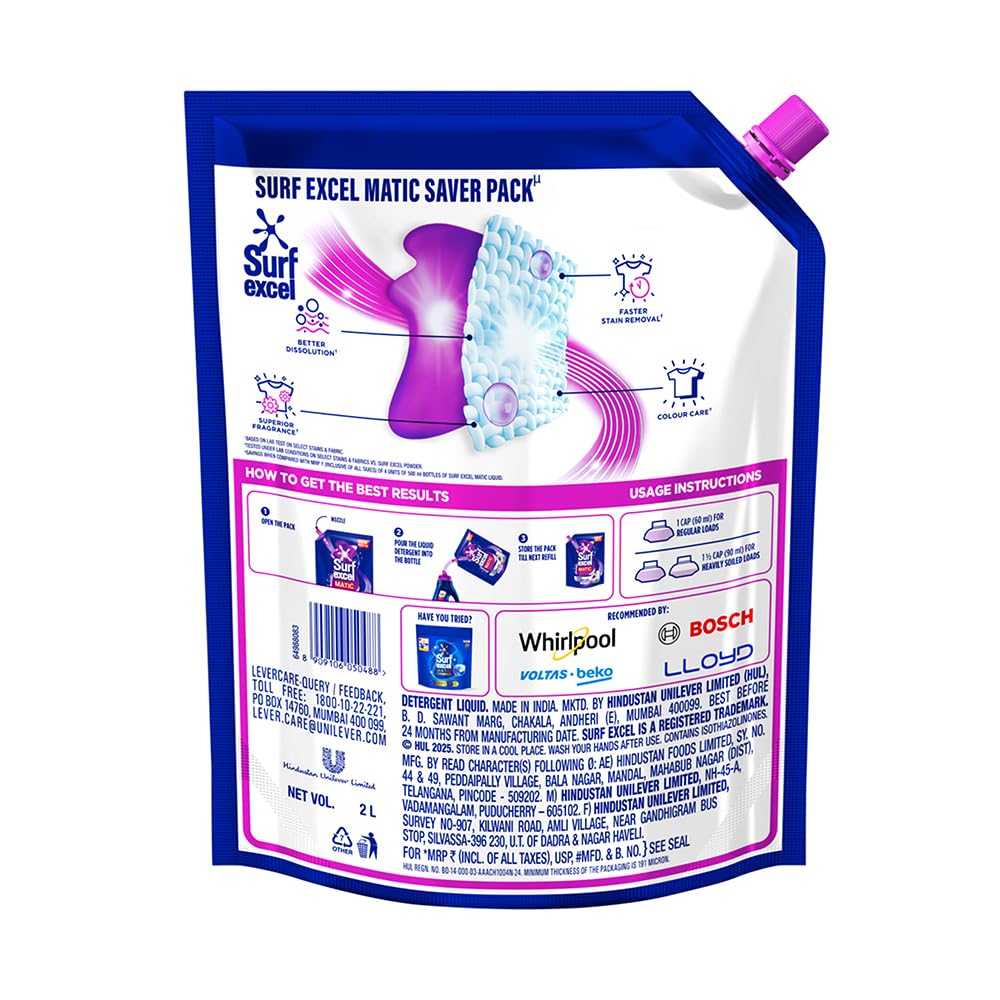 New Surf excel matic liquid Front load liquid detergent removes tough dried stains, 1st time in Washing Machine Faster stain removal in machines new Surf Excel matic liquid detergent with a powerful cleaning technology penetrates stains faster and removes tough stains in machines itself Easy & Better Dissolution: Being liquid detergent it dissolves quickly in high water level environment of washing machines|| reaches stains effortlessly and leaves no residue on clothes or in machines Machine Care: Its designed to produce foam as per washing machine type that ensures no clogging and choking of pipes and reduces scaling issues Superior Fragrance:It ensures that your clothes not only look fresh but also smell fresh Color Care: It removes tough stains in machines but retains original color of the fabric