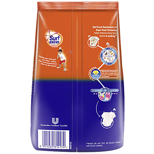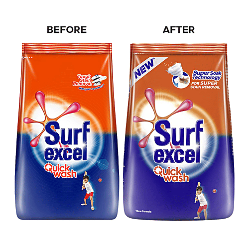 Surf Excel Quick Wash detergent powder is a one-stop solution for all your laundry needs. While learning new skills and having fun, children often come home with a variety of stains on their clothes, and more often on their very important uniforms. While you're happy that they have these new experiences, the stains leave you worried. To fight these difficult stains, you end up putting in a lot of extra effort and use additional stain removers such as bleach and lemon. It's time you switch to this detergent powder and say goodbye to long laundry routines and juggling with different stain removal products each day. It is one of the premium most detergent powders available in India and has X-Tra Clean particles that combine the power of different stain-removing products such as lemon and bleach. The superior technology of Surf Excel Quick Wash removes a variety of common tough stains like oil, ketchup, chocolate, curry stains, and tea. With X-tra cleaning particles, it makes for the perfect wash. It is available in different packs such as the 500g, 1kg, and 2kg. So go ahead and order your pack of Surf Excel Quick Wash right away and let your kids get out there clean, smart, and prepared to take on the world, and leave the stains to us. *For tough stains, pre-soak the garment in a solution of Surf Excel Quick Wash for 30 minutes.