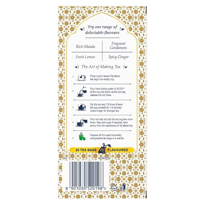 Taj Mahal Teas are Tasted, graded and perfectly blended at the Brooke bond tea excellence centre A smooth and stimulating flavor of rich masala Country of Origin: India Pack contains 25 flavored tea bags Each tea bag comes packed in an envelope to retain freshness and flavor Available in a variety of flavors