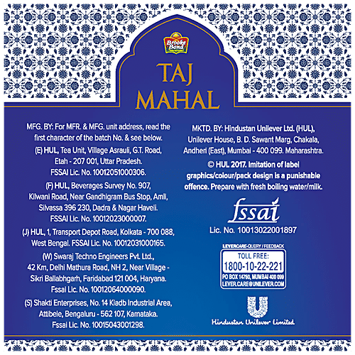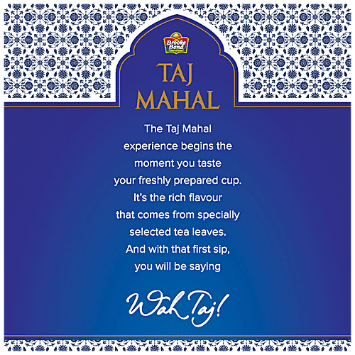 Over 50 Glorious years of Excellence. When the history of tea is written down, 1966 will be a celebrated chapter. For in that year, Brooke Bond Taj Mahal Tea was born with a promise - To foster excellence in each teacup. Fifty years on, we have not forgotten that promise. As an age-old brand, we have built the credential of Great Tasting Tea by focusing on our consistently superior quality. Every Taj Mahal cup is created by tea tasters who approve the blend by tasting 1000s of teas, then graded and blended to perfection. The brew is golden orange in colour, has a rich taste, and an uplifting aroma. The Taj Mahal experience begins the moment you taste your freshly prepared teacup. Enjoy your time in solitude, relax, reflect, and indulge by savouring the flavour of this historic blend. Feel the aroma engulf you when you bring the teacup close, and with that first sip, you will be saying WAH TAJ! Taj Mahal Tea, true to its promise of serving great tasting teas, has a range of premium handcrafted teas like black tea, green tea, white tea, and Gourmet milk tea (masala chai). Taj Mahal Gourmet Tea has an elaborated take on tea (Chai) concoctions with each flavour in the collection handcrafted by infusing exotic Indian ingredients with tea leaves. Some of these speciality teas are Royal Saffron, Bold Spice, and Darjeeling 2nd flush teas, and are available.