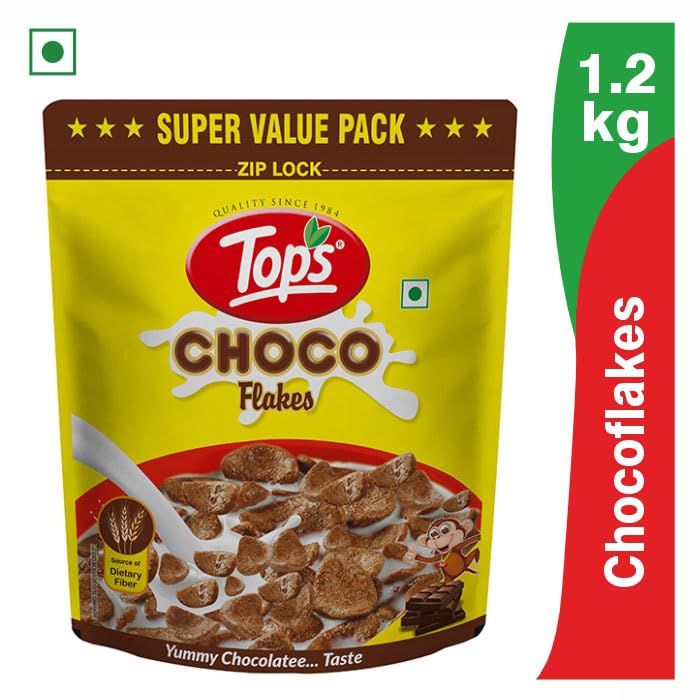TOPS Choco flakes are a popular breakfast cereal known for their delicious chocolate flavor and crispy texture. Made with the goodness of cocoa and contains proteins and dietary fibres. Quick and convenient breakfast option that is ready in minutes Contains No Added Preservatives