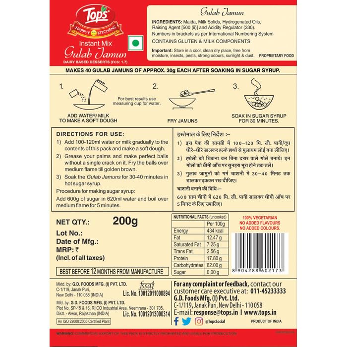 Tops “Ready-to-Cook” instant mixes combine the best of “North Indian and South Indian Dishes”. Weather it is your breakfast, snack, or desert, Tops has an instant mix product for every need. Tops Gulab Jamun Instant Mix is made using natural ingredients, that are free from any kind of added preservatives, artificial flavours and colours which makes them you perfect saviours in today’s hectic lifestyles