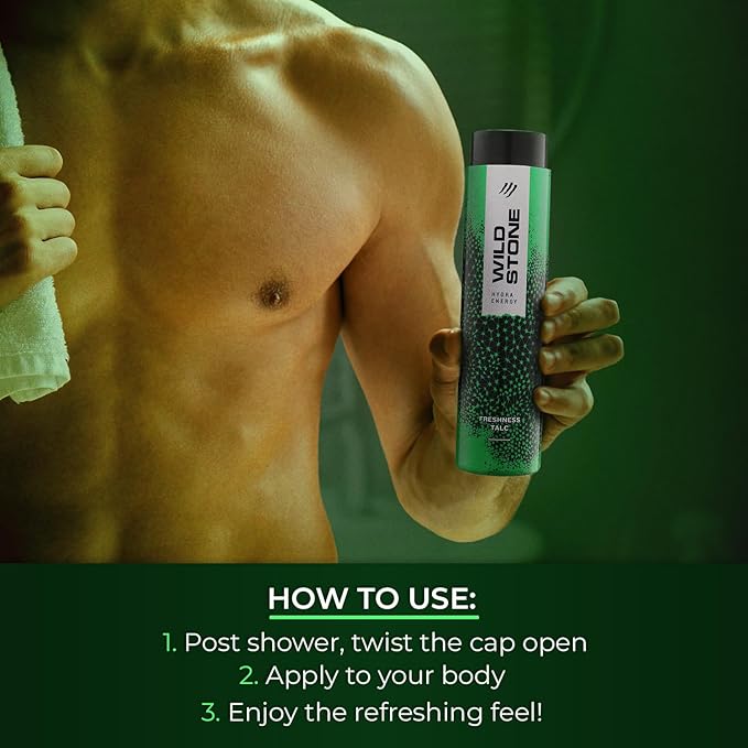 A perfumed talc with hydrating freshness, keeps you going all-through the day Power your day with all-weather freshness of this invigorating perfumed deodorant talc for men A citrus twist to floral notes over woody aromas Target Audience: Men, Safe for Skin Directions to Use: Twist open the bottle and apply over the body after a shower, feel relaxed and experience sweat-absorbent freshness