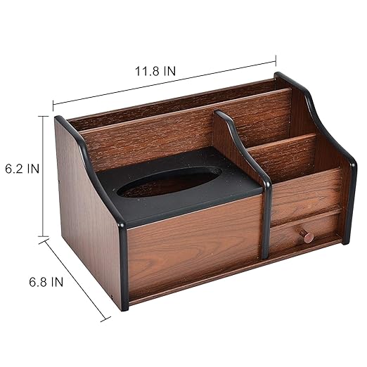 Liry Products Cherry Brown Wood Desk Organizer Tissue Box Lid Multiple Slots Drawer Tabletop Storage Cabinet Solid Wood Phone Tablet Remote Control Holder Office Supplies Caddy Accessory Sorter Home